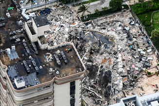 An aerial view shows search and rescue personnel working on site after the partial collapse of the Champlain Towers South on June 24, 2021. |