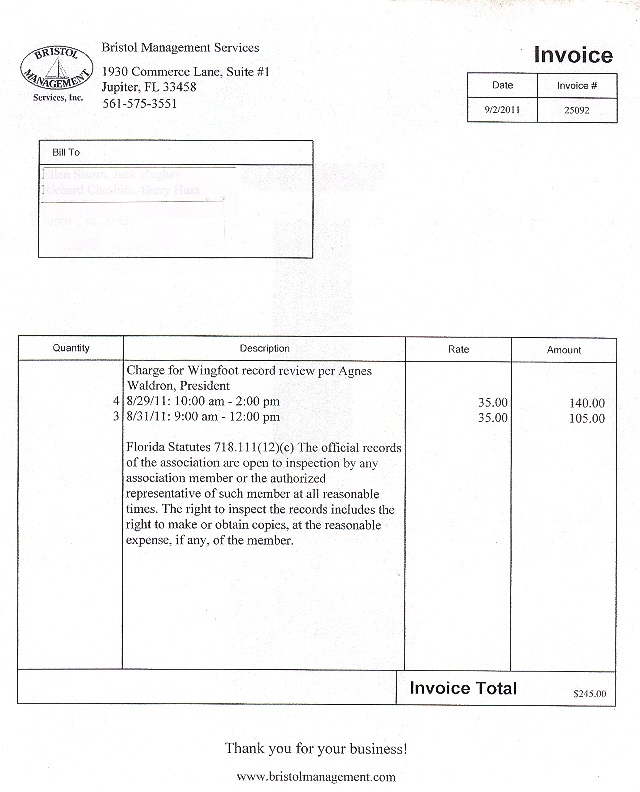 Steve Inglis, President of Bristol Management, boasts on the firm's website all kinds of experience: Past President of CAI, Member of Jupiter-Tequesta-Juno Chamber of Commerce and Member of Palm City Chamber of Commerce. Sounds impressive, but shouldn't a person with that kind of experience stop his obviously less experienced employees from sending out these kinds of outrageous bills, with amounts billed that have no legal foundation in the Florida statutes?