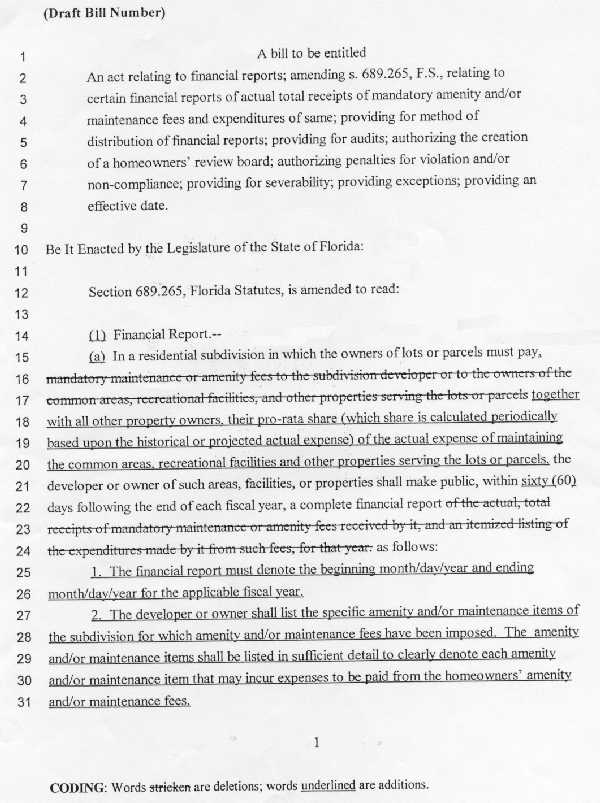Despite the fact that reforms have been enacted by various legislatures, one major issue is very obvious. Without proper enforcement all these reforms are not worth the paper they are printed on. Since last year CHIP, a Marion county based grass-roots organization, is desperately trying to get homeowners association (HOA) reforms enacted. A Marion County Ordinance 00-20, dated 7-11-2000, was enacted to no avail. Many of the developers plainly disobeyed the required filings, because there wasn’t any possible enforcement. Senator Anna Cowin pledged support for HOA reform during her last election campaign. All she mustered was a local bill in the very last minutes of the legislative session, after 6 drafts and visits to her office by 10 developers and/or lobbyists for the stakeholders, which was doomed from the outset. Hopefully, her constituents will present her with "the bill" during the next election campaign, if she decides to run again? It is definitely of great importance for us, the citizens of Florida, to let politicians know how we feel about broken campaign promises. We really don’t need any more politicians whose interests are more in favor of campaign funds than that of their constituents. According to the latest information (see article below) CHIP is now trying to get another local bill enacted, regarding disclosure and financial reports. The CHIP board of directors seems to be willing to meet with politicians and lobbyists behind closed doors. Activists all over the State are fighting with boards and developers to comply with specific HOA laws for notice of meetings to avoid 'secret' meetings. Do we now want to disregard these issues and start with closed meetings? It will definitely not be to our advantage,