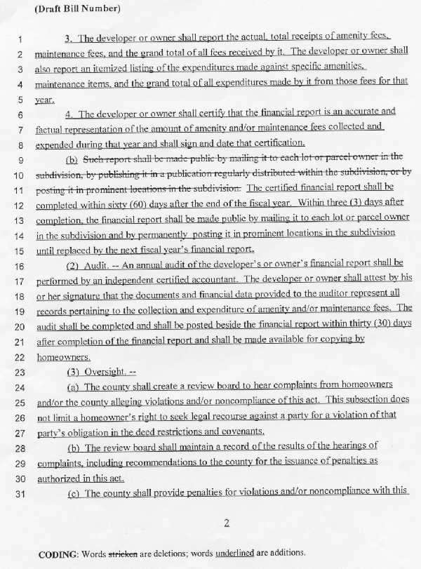 07/06/01 The leaders of Concerned Homeowners in Partnership (CHIP) on June 28 explained their new strategy for the upcoming legislative session to members. The group is trying to change state law regarding financial reporting and pre-sales disclosure in deed restricted developments. Currently there is a loophole for many developments requirements in reporting the accounting for maintenance fees and amenity fees. There is also no requirement or provision by the state for what CHIP says is critical information from deed restricted developments to potential buyers before a sale, and CHIP believes many buyers don’t understand what they are in for when they buy in those developments. At the very least, CHIP believes potential buyers ought to know what questions to ask, because people who move from other states simply don’t know what to ask, said CHIP board member Fanny Vail. CHIP President Buddy Catledge explained what CHIP’s goals are for this legislative session, which will begin early because of reapportionment following the census. Last year CHIP had a bill introduced that covered all the areas it felt needed to be addressed in state statutes. The bill did not get out of committee, but Catledge said this year will be different. For one thing, he said, CHIP is a lot wiser about how the legislative process works. Secondly, it’s preparing the ground by conferences with legislators and lobbyist on both sides of the issue before the session. The bill that will be introduced this session will be different from last year and have a new Senate sponsor Catledge said. It will be different in that it will focus solely on financial reporting of amenity and maintenance fees, he said. The county commission passed an ordinance requiring that last year, but found many developments were exempt by state law. CHIP’s bill would require all deed restricted communities to annually account for the fees, giving the oversight to the county and allowing it to dispense punitive measures. Catledge said a local, county appointed advisory review board would probably be the best vehicle to deal with complaints and disputes, but the county would be the enforcer and levy penalties. CHIP has a copy of its proposed bill, but all that is yet to be worked out before the bill is filed again. As to the disclosure issue, CHIP is pursuing that through the Department of Agriculture’s Consumer Services, which has expressed interest in something like a brochure or statement that would explain everything a buyer needs to know. The county commission referred to such a document as a “Homeowner Bill of Rights,” which it has urged CHIP to come up with and push. Catledge said he’s not sure at this point if such a measure could just be implement by the state as a regulation or if the statutes will have to be changed. Either way, he said, because of the scope of the impact, “The implementation of this is going to be monumental.” It would affect all sales in Florida by deed restricted developments, sales by owners in those developments and sales by real estate agents in the those developments. He said it could be one of the most important things that happens in home buying in Florida for a long time. Board member Pat Sasso said that while some developers might oppose it, good developers who are fair and open with buyers will probably embrace it because it finally levels the playing field. “Maybe Marion County wants to lead the way to change,” Catledge said, adding, in what is a buyer beware county – actually in the state as a whole.” Catledge said he thinks CHIP has a very good plan of action for the coming year and said his group needs the support of residents in deed restricted communities and from deed restricted homeowner groups. Both a draft of the bill and a draft of the disclosure state is available from CHIP. Catledge can be reached at 352-861-1288 |