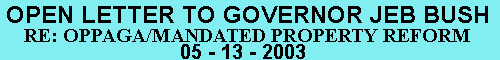 SUBJECT: OPPAGA/MANDATED PROPERTY REFORM Dear Governor, As you have pointed out in your electronic newsletter dated 5-6-2003, the results of this year’s legislative sessions were not satisfactory for Florida citizens. Recent polls and commentaries showed clearly that the Florida House and Senate left many problems unsolved in the opinion of the citizens who elected them into office. A very pressing problem is finding a solution for the more than 5 million citizens living in mandated properties in Florida. Names like Nature Watch, Miramar and Forest Lake make negative headlines, damaging even more the already problematic reputation of Florida’s housing industry. This is a fact much observed by many of our Northern neighbors, who consider Florida as their retirement home. Lack of consumer protection is the reason why Florida lost the Number One spot on the list of states competing to attract retirees. Aggressive advertising should be accompanied by legislative moves to protect the retirees targeted by this advertising. Quantity is not promoted by lack of quality! For many years homeowners' activists from all over Florida have pointed out that reforms are necessary. During the past two years a bill has been circulated in the legislature asking for a Mandated Property Reform Task Force (HB 547 + SB 1248) with growing support of various legislators from both parties. This year everybody thought we got a break-through when representatives from industry and homeowners' activist groups agreed upon a proposal - see below - for the existing bill, which seemed to please all parties with a vested interest. Good compromises were worked out. OPPAGA was supposed to take the lead role in bringing all parties together at one table and getting the necessary input to suggest legislative reforms that everybody involved considers necessary. But for unexplained reasons, the Florida Senate failed to introduce this amendment and left the House no other possibility except to kill the bill. Actually, the only reasonable explanation for this bill ending up on your desk for your signature seems to be lack of time in the end. It doesn't happen too often that consumers and industry are trying to work together to find solutions. But that makes it even harder to understand why the Florida Senate was unwilling to accept this offer underwritten by all sides. Considering the circumstances, this would have been a solution with no opponents! What else can a good legislator wish for? We have a special session starting this week. The tools are still in place with all parties willing to work together for the improvement of living in our State of Florida. You have the possibility to get our legislators on the right track. Please use your influence for the good of the citizens of Florida. You could as well create the same scenario by executive order. But please do something - many interested eyes are looking at you after the Florida Senate failed us so far. The only other possibility for a feasible
