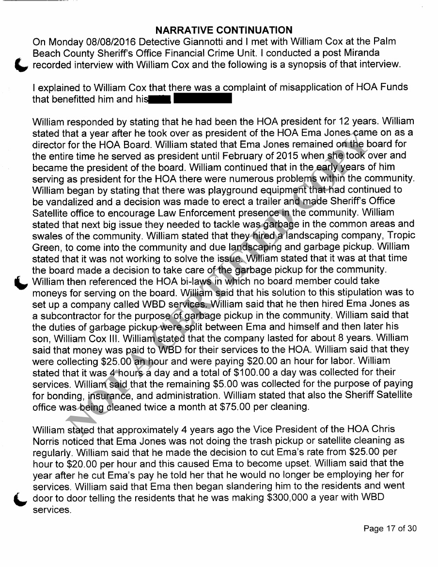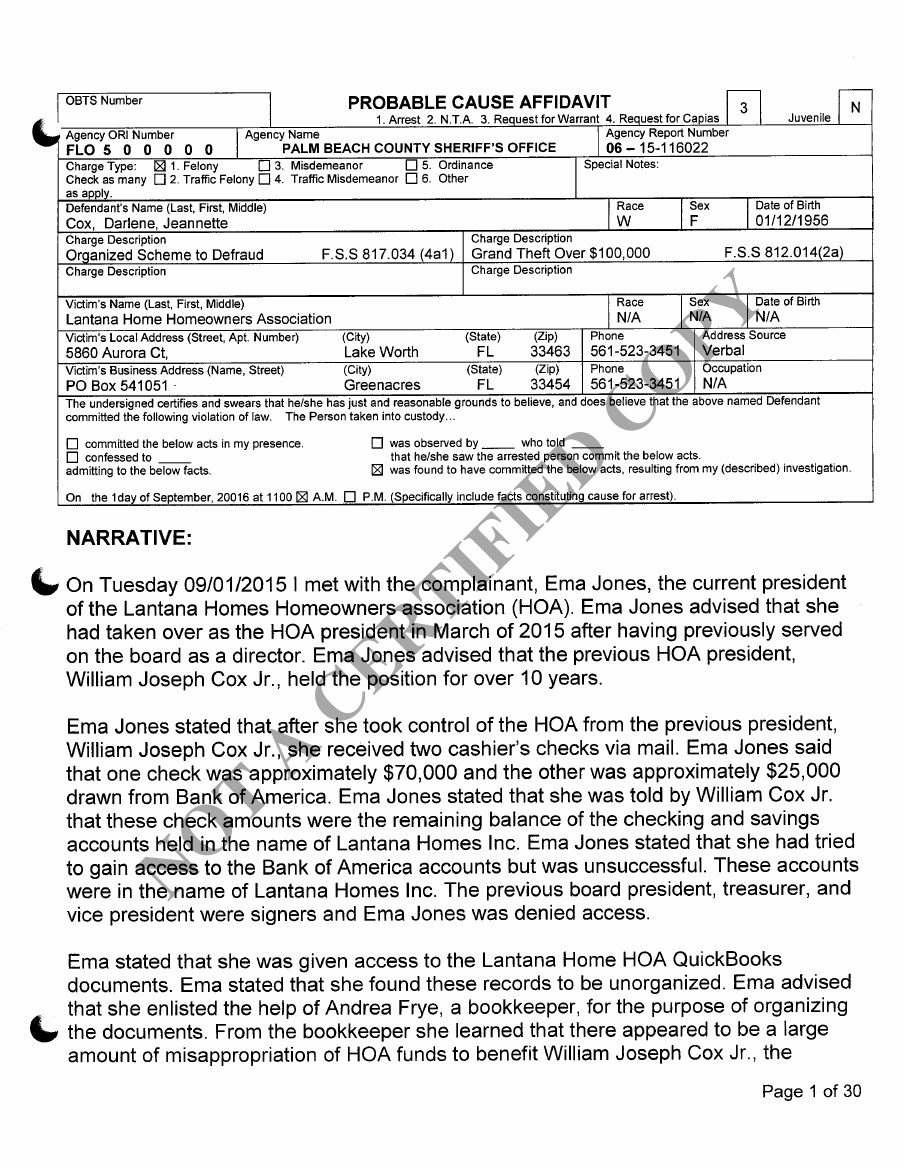 The Palm Beach County Sheriff's Office arrested Darlene Jeannette Cox and her