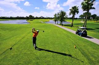 A golfer takes a swing on a golf course at The Fountains