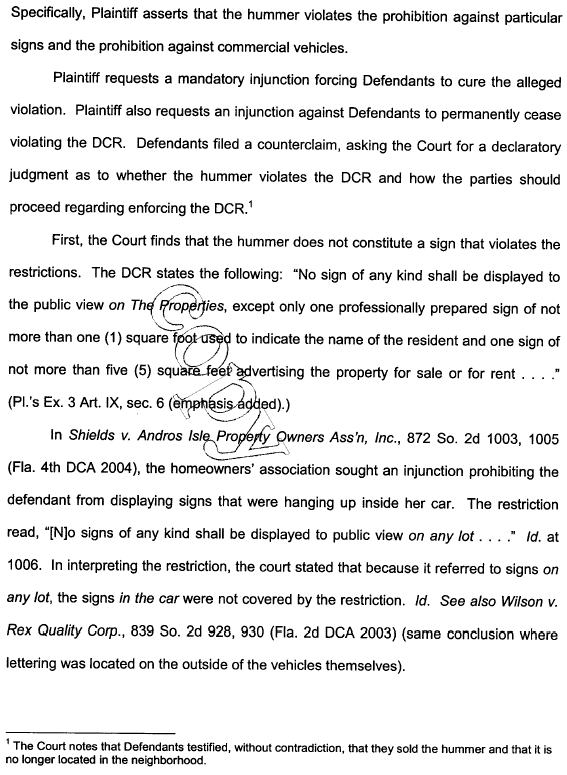 Hummer also did not violate the sign restriction, final judgment is hereby