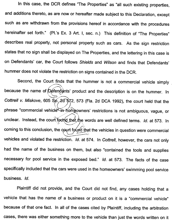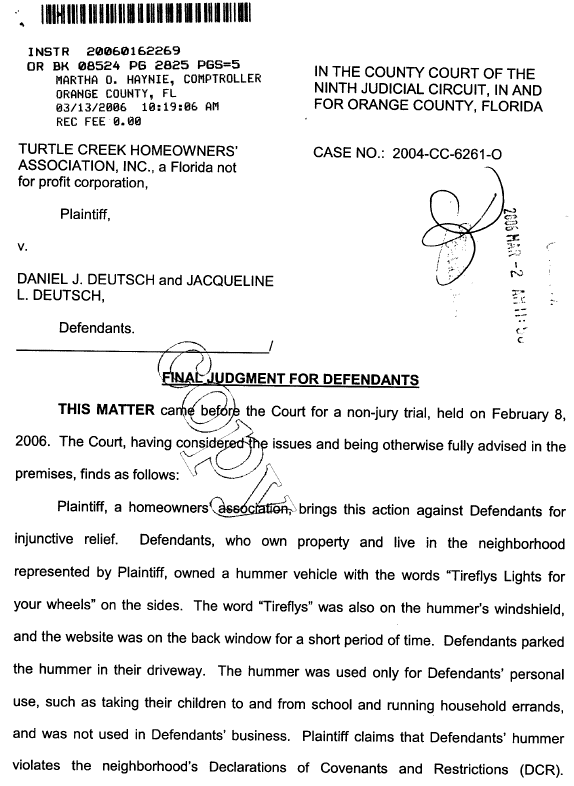 The whole issue -- was it really worth it? -- was the claim by the homeowners' association that the defendants had violated the deed restrictions by parking in their driveway a Hummer that the association board considered a "commercial vehicle." The actual violation: "Tireflys lights for your wheels" was written on the sides of the vehicles.
