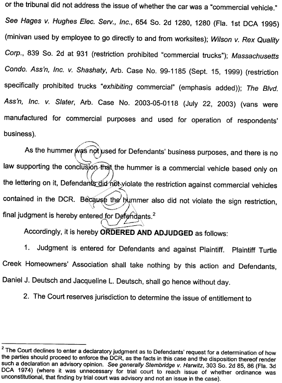 I always wonder how so-called experts can talk board members into risking their community’s money by filing lawsuits such as this. It's a lose-lose situation for starters, because even a favorable judgment wouldn't really serve the community. Who actually believes that suing a neighbor for parking a Hummer with company insignia in the driveway will raise the property values?
