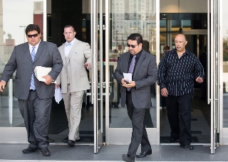 Brothers Rudolfo Alvarez-Rodriguez, third from left, and Jose Luis Alvarez, far right, leave Lloyd George Federal Courthouse Thursday, May 22, 2014.