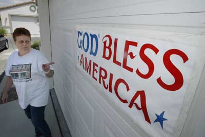In a "courtesy notification" sent to Briggs and her husband, Gary, last week, the association told them to remove the sign, which they classified as a banner. "It must come down immediately," the letter read. Joni Briggs is steamed. "First I was really hurt," she said. "Then I got angry." Briggs said she immediately fired off a letter to the Sterling at Silver Springs homeowners association. With a red marker, she wrote the word NO in large letters, and explained that she would not take the sign down until friends of hers who are serving in the military in the Middle East come home. "What are you," she wrote, "anti-American or complete idiots?" She also sent off letters to the media, with pictures of her garage door. Contacted Wednesday, Property Manager Eyoshi Milerlei said Briggs appears to be overreacting. No fine has been imposed, and she has not formally been found in violation. And, Milerlei added, the Briggses can appeal to the homeowners association board for a waiver. The board is "very flexible," she said. Still, there clearly are rules that prevent such signage, she said. It's not like the association is trying to stop them from flying the American flag or anything. "The association doesn't want to inhibit anyone from displaying their patriotic feelings," Milerlei said. "But we have governing documents that people must follow." Briggs admits she is passionate about many things. She said the issue over the sign on her garage door especially fires her up because her father-in-law, an 83-year-old World War II veteran who is dying of cancer, made it specifically for them. It was just three weeks after the Sept. 11, 2001, terrorist attacks when Raymond Briggs, a retired sign painter, sent the sign from Ohio. The Briggses, who live in a new subdivision near Sam Boyd Stadium in southeastern Las Vegas, taped the sign to their garage door on the Fourth of July last year. No one said a word, and they took the sign down the next day. Then, this year, when President Bush ordered Saddam Hussein to leave Iraq or be forced out, the Briggses figured war was inevitable, and so they taped the sign to the garage door again. That was on March 17. Six weeks passed before the letter from their homeowners association came. "We've never had an altercation with the homeowners association. We don't break the rules," said Joni Briggs. "But I am not going to give up on this." She said her nephew recently returned from Iraq, but the sign stays up while several other family friends are still overseas. That's OK with her neighbors. "I think it's fine," said Annie Mayer, who lives around the corner from the Briggses. "I don't see why you can't have something on the garage door, especially at a time like this." Next door to Mayer, Fay and Sylvester Smith said Briggs' sign never bothered them. "If she feels strongly about something and she wants to express herself, that's her right," Sylvester Smith said. Across the street from Briggs, Shelby Long, who served in the Marine Corps from 1946 to 1948, said he likes his unobstructed view of the 41-inch by 15 1/2-inch sign. "Don't bother me at all," he said. "In fact, I'm glad to see it there." |
