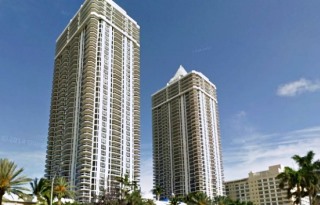 "Located on 500 feet of pristine beachfront property," the towers' website gushes, "our 45-story condominium towers will certainly dazzle you."
