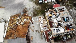 A damaged business is seen in the aftermath of