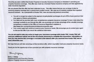 In Citizens' followup letter to homeowners, no opt-out form is included. But there is strong language warning of the potentially dire consequences to resist the automatic switch. The letter describes the "beneficial offer" from the takeout company and warns that those who remain Citizens policyholders may have to pay surcharges totaling up to 45 percent of their premiums.