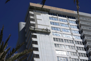 Workers make repairs to the facade of the Parker